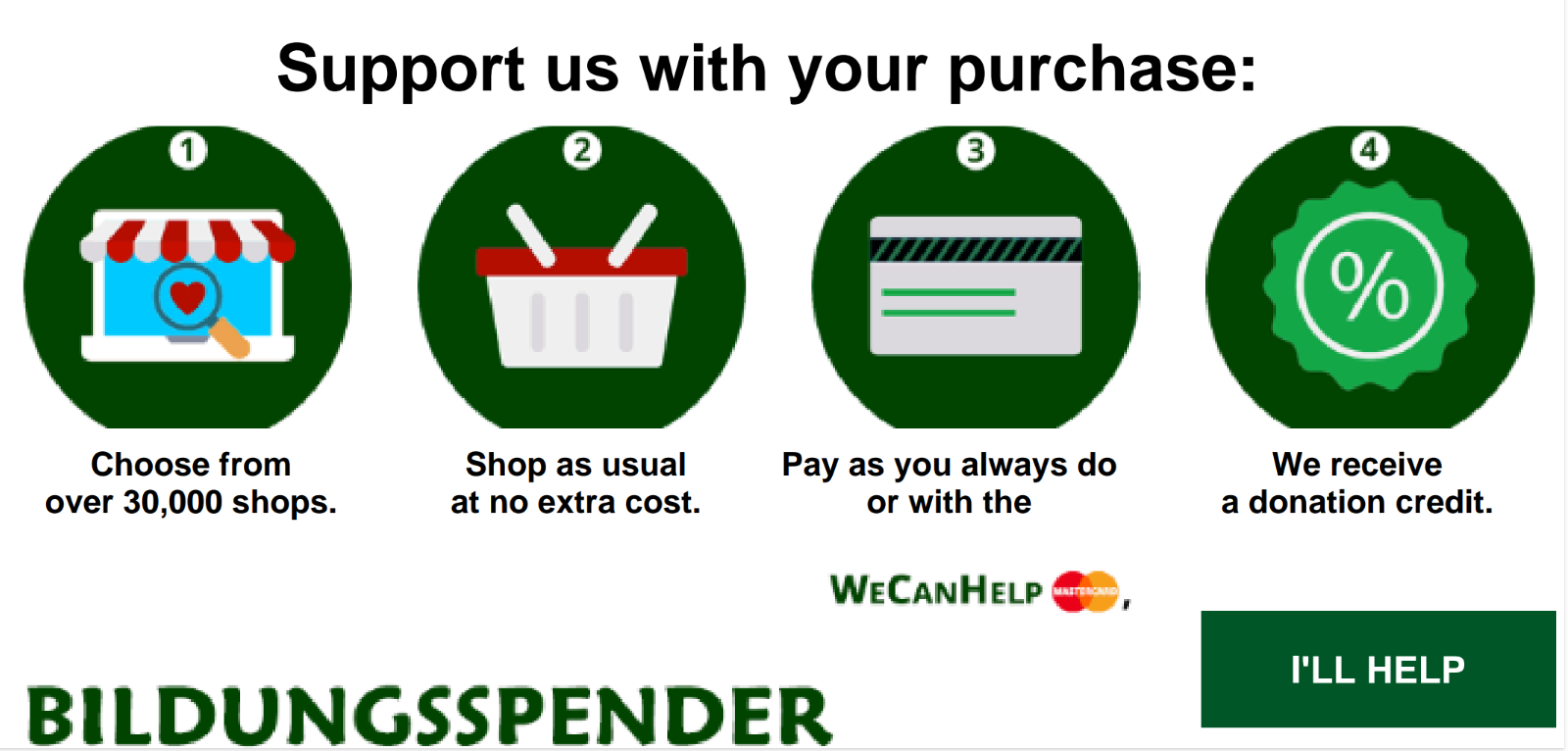 Support 4LIFE e.V.'s educational projects through your online purchases at no extra cost to you: It's easy with Bildungsspender.de! You can support our work while shopping online, at no extra cost to you.